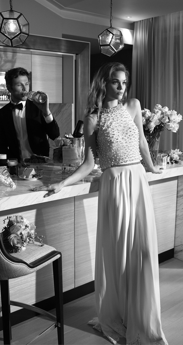 Lihi Hod bridal gowns are truly unique in their design, fabrics and silhouettes. Depth is created by combining layers of opaque and transparent fabrics such as silk chiffons and tulles with a variety of laces. Swarovski crystals, glass beads and gemstones are used in true couture techniques.The collection features low cut backs on many styles.