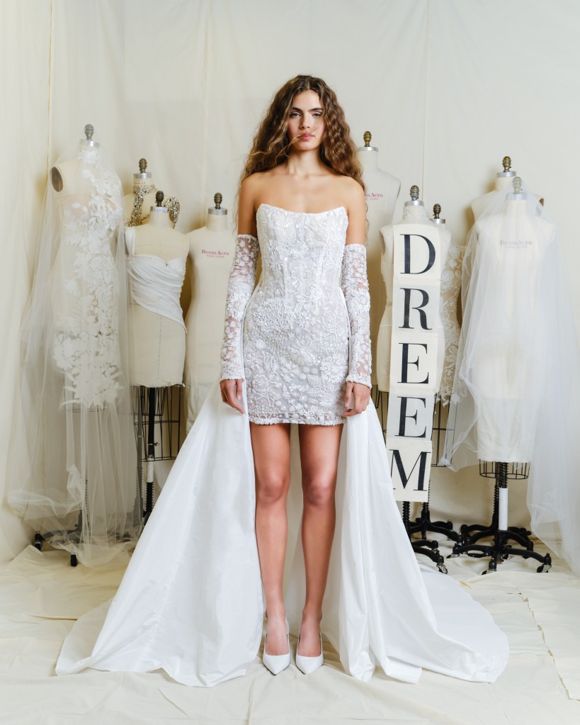 The Reem Acra Fall collection is an ode to versatility and self-expression. Brides are offered a wide array of accessories and styles to celebrate their unique tastes. Long A-line silhouettes, opulent ball gowns, chic short dresses, and an array of elegant trains are all part of this collection. What truly sets this collection apart is its inclusion of jackets, detachable hoodies, boleros, gloves, and belts, designed to meet the diverse needs of brides.